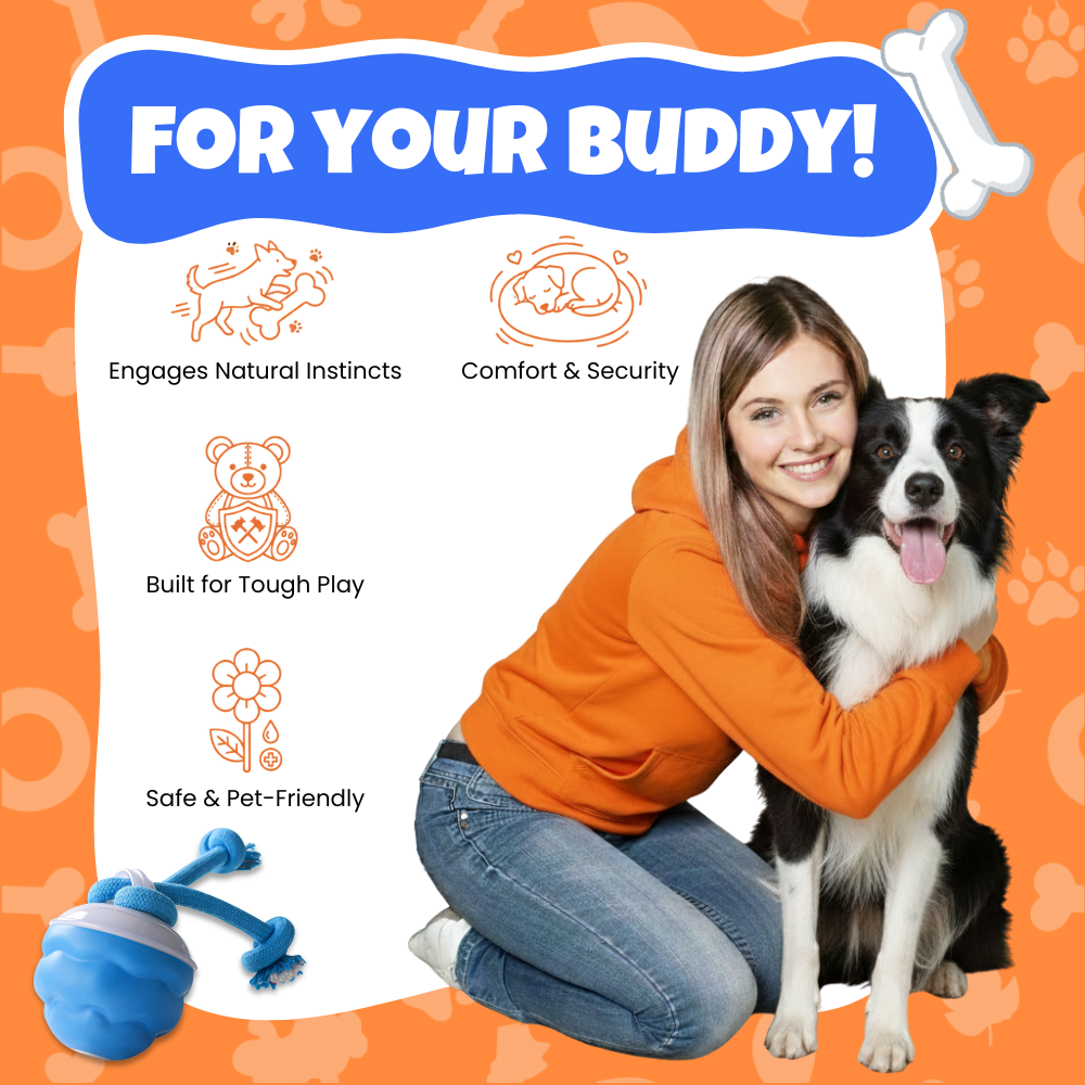 Stop boredom and separation anxiety with our Smart Auto-Rolling Ball. Designed to keep energetic pups engaged for hours, this ball moves, bounces, and reacts all on its own. It’s the perfect hands-free solution to keep your dog happy, active, and entertained while you’re busy or away.